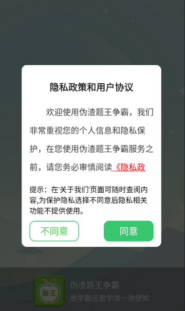 1、打开伪渣题王争霸app,点击同意隐私政策