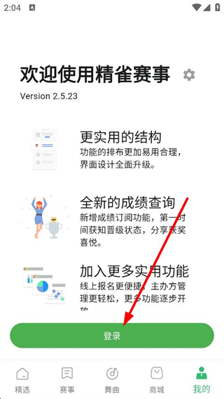 2、我的页面点击登录,可进入登录流程,该平台升级后功能布局更合理,新增成绩订阅等实用功能,便于赛事相关操作。
