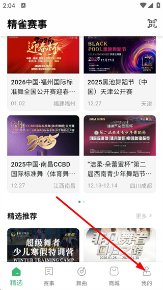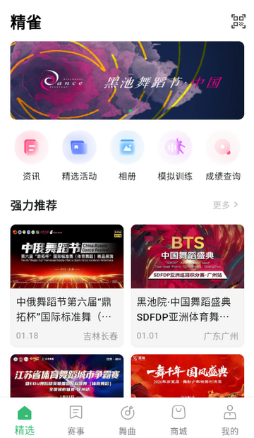 1、进入精选页面可浏览各类赛事信息,包含不同地区的舞蹈赛事,还能查看精选推荐内容,底部导航可切换至赛事舞曲等功能板块。