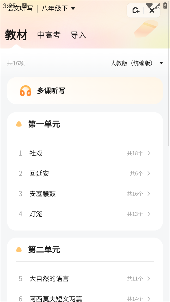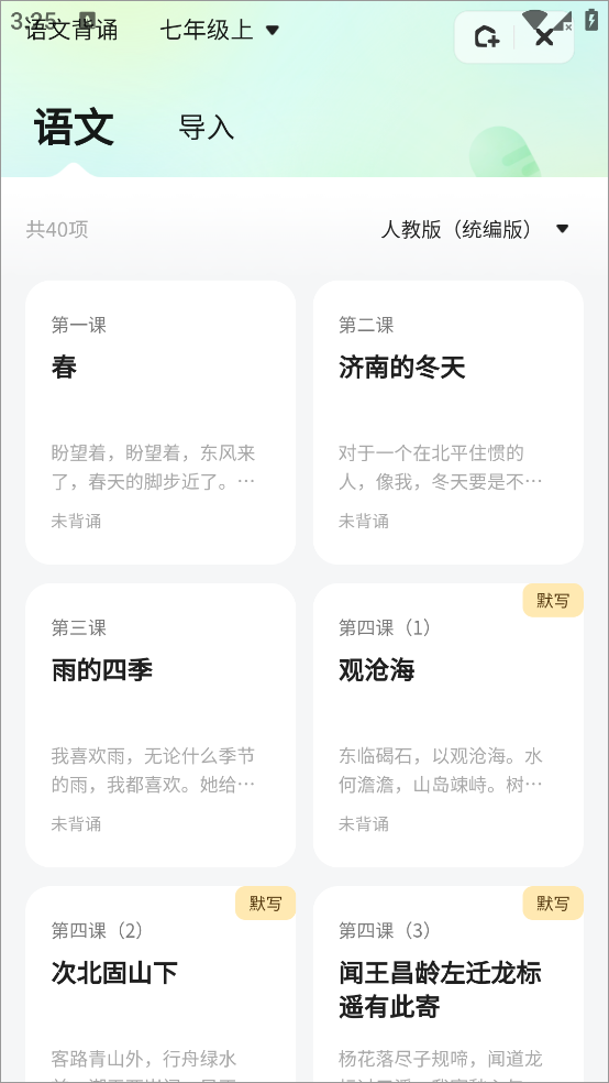 3、点击语文背诵功能,同听写功能一样进入教材目录,可随意选择课文进行默写,此外还可以手动导入app内没有的课文