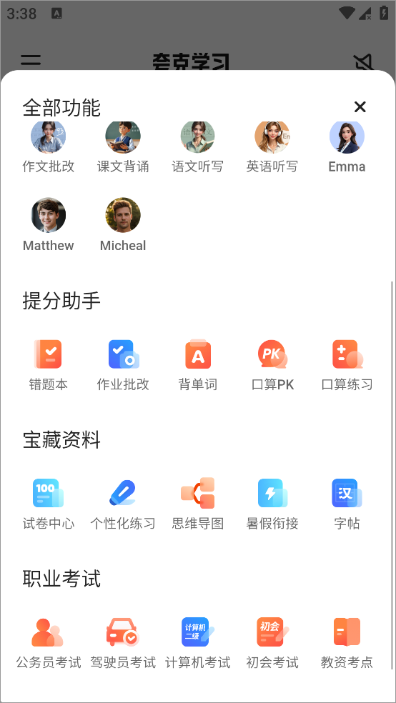 4、点击全体智能体,可以解锁各种其他学习功能,此外app内还提供了公务员、驾驶员、教资、计算机等各种不同的社会职业考试