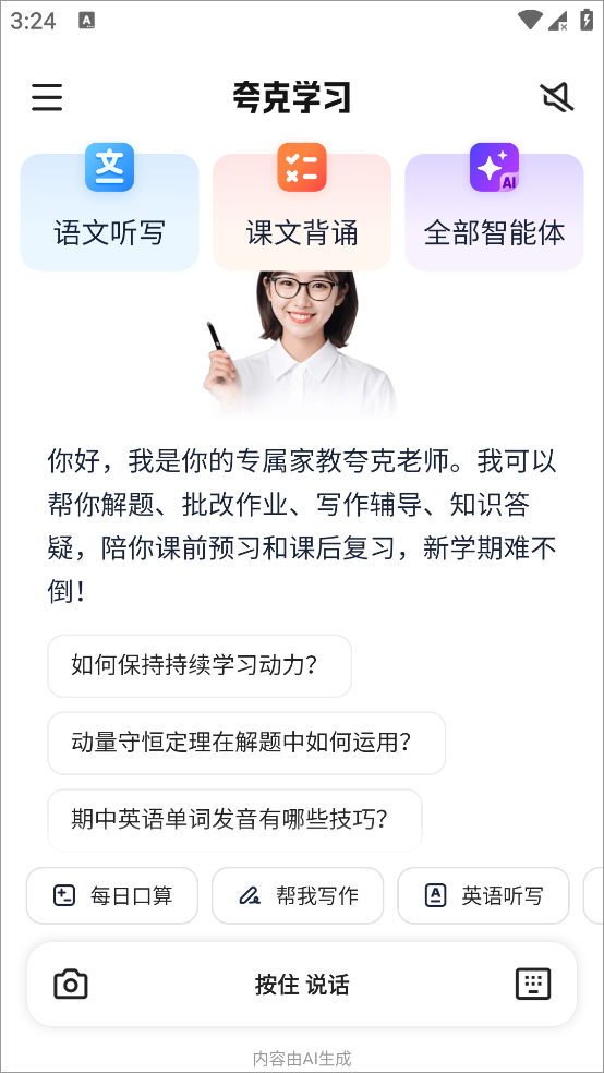 1、打开app后首页就是我们的夸克老师有任何问题都可以直接在对话框内进行提问,夸克老师将会通过文字与视频结合为你解答