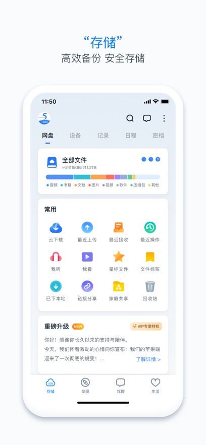 原先的115网盘客户端已更名为115生活,这里的115网盘app又名115网盘极速版,是个全新的产品,专注云存储功能,为用户提供安全,稳定,高效且智能的服务,用户可以在手机上体验一站式的数字生活,支持数据同步,文件随存快取,智能化的管理,趣味的空间等功能,更多好玩好用的内容等你来发掘。