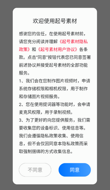 1、点击进入起号素材app,点击同意隐私政策