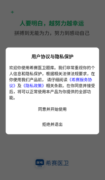 1、打开希赛医卫题库app,点击同意隐私政策