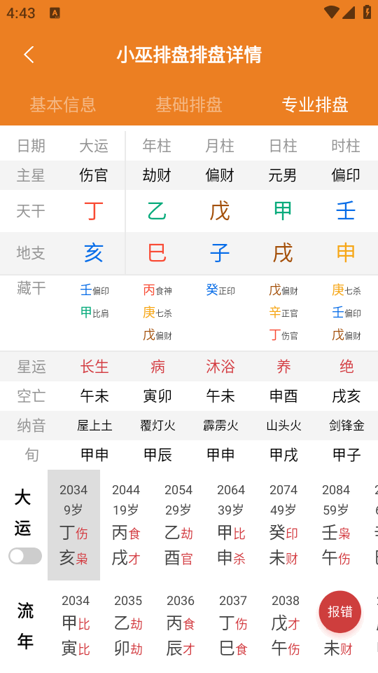 4、专业排盘中有大运,年柱,月柱等详细内容可自行查看。