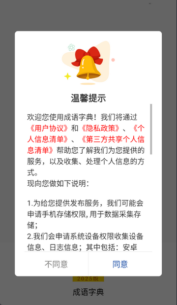 1、打开成语字典app,点击同意隐私政策