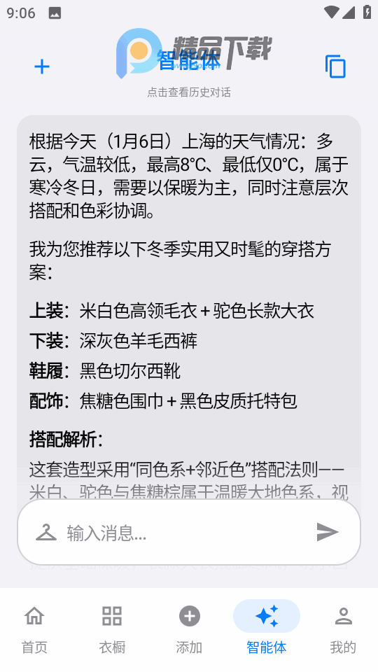 3、通过智能体可以帮你根据天气地点温度搭配衣服。