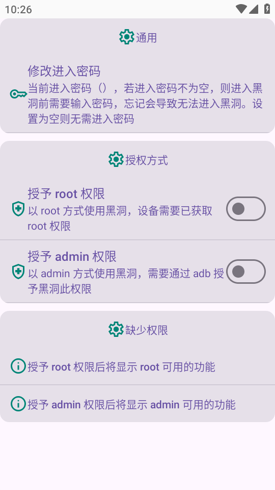 3、当然如果用户设备实在不好获取root权限,也可以通过app中的adb调试权限的开启来获取设备的adb调试权限,不过该权限会有相应的功能会受限,还好可以基本上功能可以正常使用。