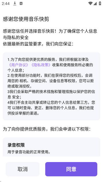 1、打开音乐快剪app,点击同意隐私政策