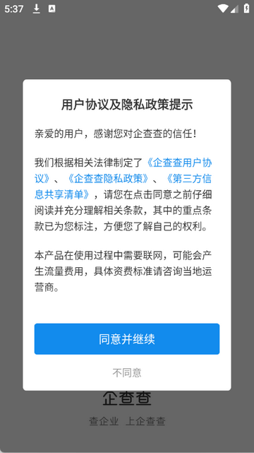 1、打开企业信用信息查询app,点击同意隐私政策