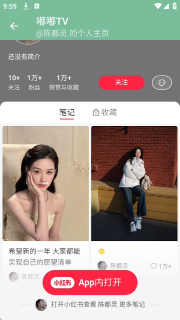 3、点击小红书可进入陈都灵个人账号