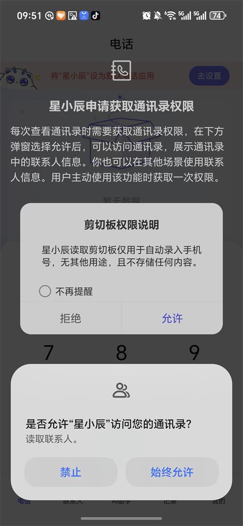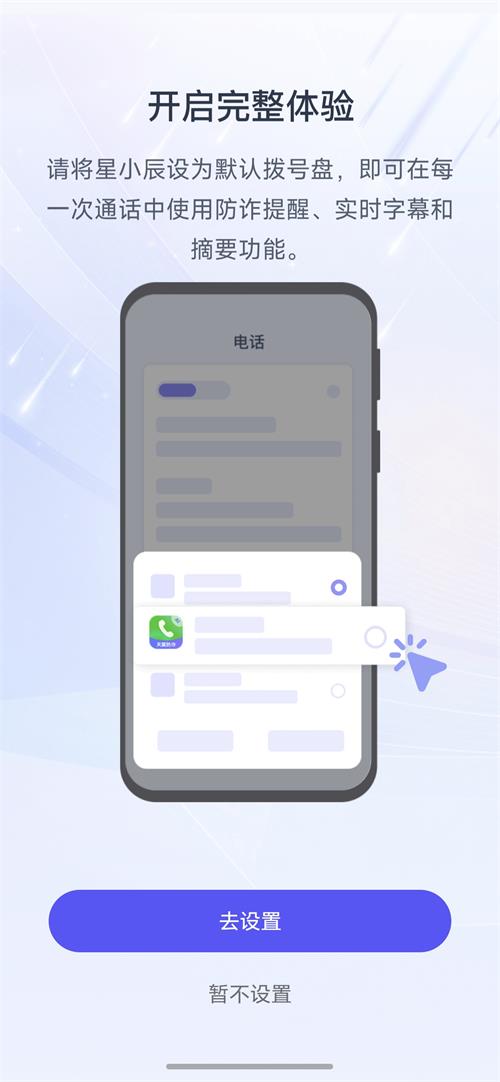 请注意:星小辰作为中国电信自主研发的通话应用,AI 通话相关功能仅面向中国电信号码,需在成功开通对应业务后方可使用。为确保天翼智能防诈等能力正常运行,请将星小辰设为手机的默认通话应用,并确保以下三项号码保持一致: