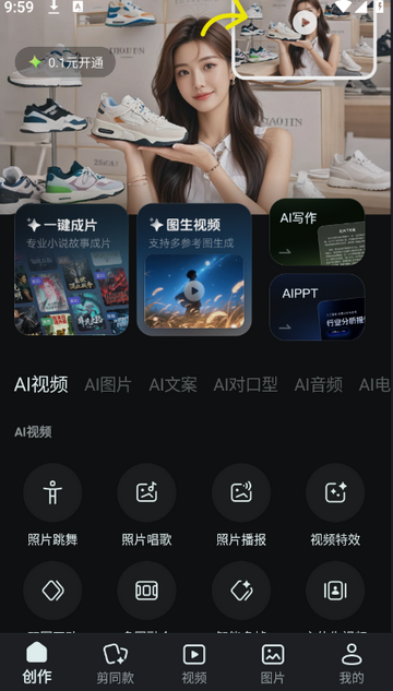 2、进入创作,可以选择一键成片/AI写作等功能进行创作