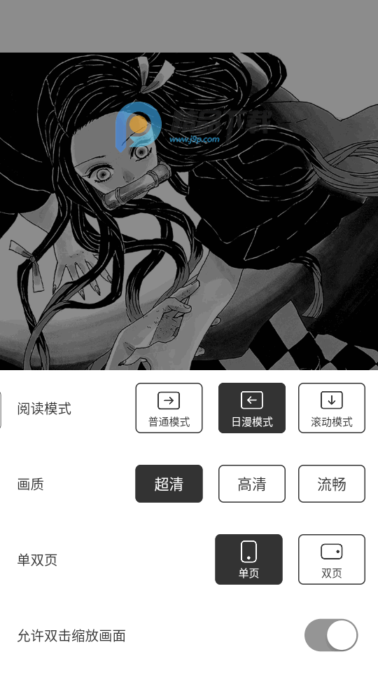 在漫画阅读页时。点击屏幕中间区域,呼出工具栏,点击右下角设置,即可切换阅读模式、画质和横竖屏模式。