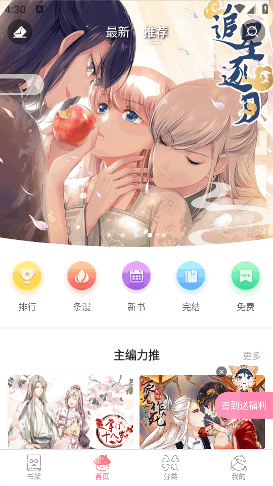免费漫画想看就看,专属定制漫画类型,漫看漫画app打开即可直接看,任务多简洁方便好用,支持将喜欢的漫画收获或者下载缓存到手机上慢慢看,支持自由设置软件主题,分类很全,免费专区和精品专区任你选择,爱看漫画的可以试试。