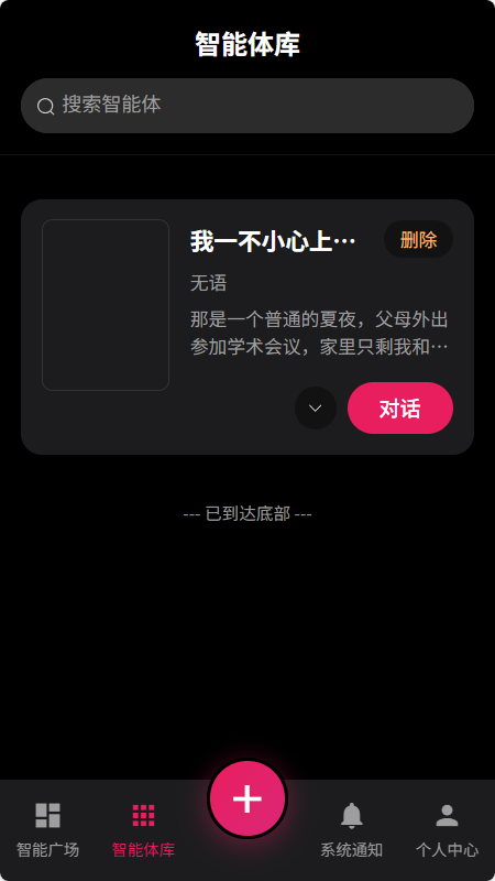 4、来到【智能体库】,能看到刚刚导入进的角色,点击【对话】开始聊天