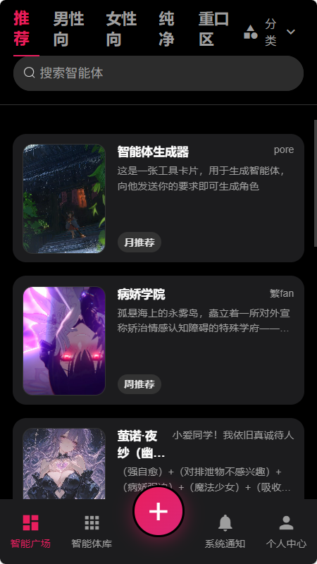 1、在【智能体广场】,可以筛选自己喜欢的角色