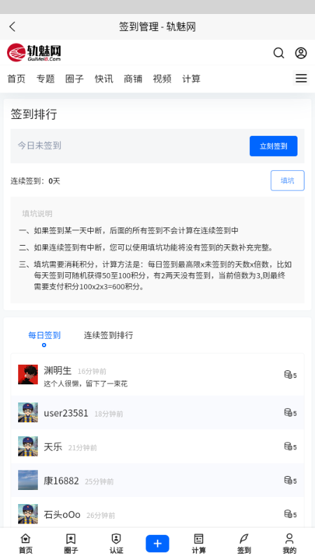 填坑需要消耗积分,计算方法是:每日签到最高限x未签到的天数x倍数,比如每天签到可随机获得50至100积分,有2两天没有签到,当前倍数为3,则最终需要支付积分100x2x3=600积分。