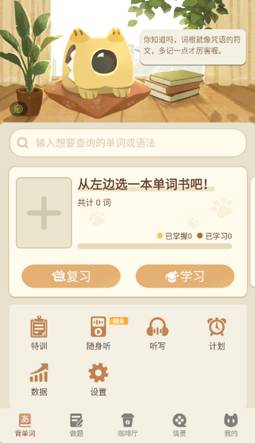 2、进入首页背单词,可选择特训/随身听/听写等学习方式