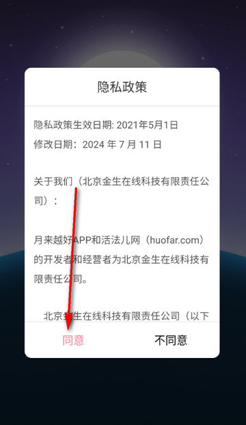 1、打开月来越好app,点击同意隐私政策