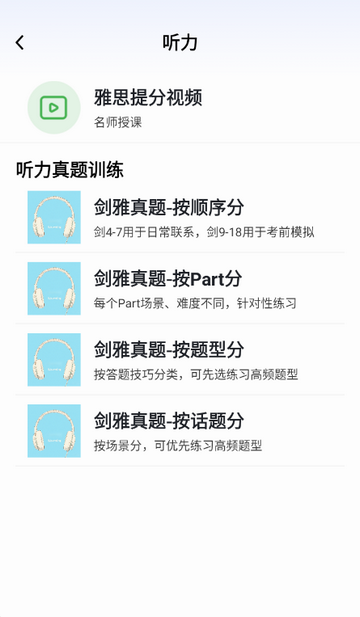 3、其次软件对学习资源进行了清晰的分类,如听力、口语、阅读、写作等,