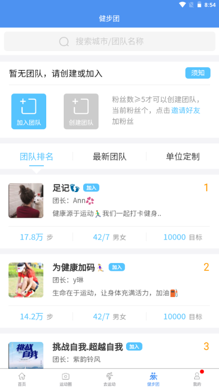 团队管理:支持创建企业健步走活动,管理员可一键下载步数统计报表(Excel格式),查看个人和部门的排名、达标情况等。
