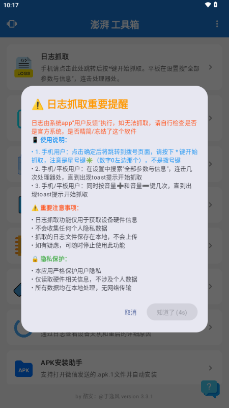 点击app首页第一项日志抓取,跳转到拨号页面输入“*”(星号键),注意不是拨号键!