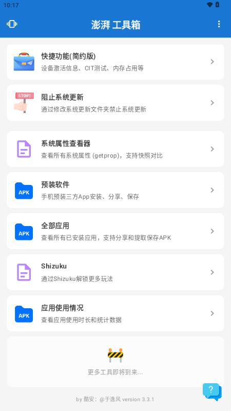 澎湃工具箱是酷安大神自制的一款小米专用工具箱,功能全面可以查看小米手机的电池使用情况,可帮助用户直接安装apk.1的文件,查看充电数据,电池健康,日志抓取等功能,功能非常多非常全面,可以查看手机真实的内存储存,需要的可以下载使用此软件。