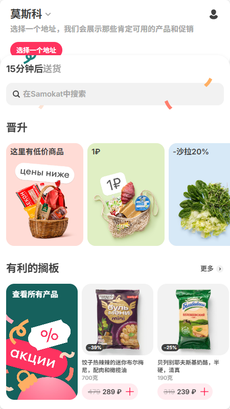 俄罗斯许多城市提供快速免费的现成食品、杂货和其他商品送货上门服务:阿克赛、阿尔梅季耶夫斯克、阿纳帕、阿尔乔姆、阿斯特拉罕、巴拉科沃、巴拉希哈、巴尔瑙尔、巴泰斯克、别尔哥罗德、别尔德斯克、布良斯克、布格里、大诺夫哥罗德、上皮什马、维德诺耶、弗拉基米尔、伏尔加格勒、伏尔加斯基、沃洛格达、沃罗涅日、弗谢沃洛日斯克、加特契纳、格连吉克、戈雷洛沃、捷尔任斯克、捷尔任斯基、多尔戈普鲁德内、多莫杰多沃、德罗日诺、叶卡捷琳堡、茹科夫斯基、泽列诺格勒、泽列诺多尔斯克、伊万诺沃、伊万捷耶夫卡、伊热夫斯克、约什卡尔奥拉、喀山、卡卢加、克麦罗沃、基洛夫、科洛姆纳、科尔皮诺、科利佐沃、科罗廖夫、科斯特罗马、科捷尔尼基、克拉斯诺戈尔斯克、克拉斯诺达尔、克拉斯诺亚尔斯克、喀琅施塔得、克斯托沃、库德罗沃、库尔干、库尔斯克、利佩茨克、洛布尼亚、罗蒙诺索夫、洛帕蒂诺、利特卡里诺、柳别尔齐、马格尼托哥尔斯克、迈科普、莫斯科、穆里诺、梅季希、卡马河畔切尔尼, 涅夫捷卡姆斯克, 涅夫捷尤甘斯克, 下卡姆斯克, 下诺夫哥罗德, 下塔吉尔, 新阿尔泰斯克, 新德维亚特金诺, 新库兹涅茨克, 新伊比雪夫斯克, 新罗西斯克, 乔迁之喜, 新西伯利亚, 新切博克萨尔斯克, 诺金斯克, 奥布宁斯克, 鄂毕, 奥金佐沃, 鄂木斯克, 奥廖尔,奥伦堡、奥列霍沃-祖埃沃、奔萨、彼尔姆、彼得罗扎沃茨克、波多利斯克、普斯科夫、普希金诺、拉缅斯科耶、鲁托夫、顿河畔罗斯托夫、梁赞、萨拉瓦特、萨马拉、圣彼得堡、萨兰斯克、萨拉托夫、谢尔盖耶夫镇、谢尔托洛沃、谢斯得罗列茨克、斯摩棱斯克、索契、斯塔夫罗波尔、斯塔里奥斯科尔、斯捷尔利塔马克、苏尔古特、塔甘罗格、坦波夫、特维尔、陶里亚蒂、托木斯克、图拉、秋明、乌里扬诺夫斯克、乌法、弗里亚济诺、希姆基、切博克萨雷、车里雅宾斯克、切列波韦茨、谢尔科沃、谢尔宾卡、埃莱克特罗斯塔尔、恩格斯、雅布洛诺夫斯基、雅罗斯拉夫尔、下瓦尔托夫斯克和汉特-曼西斯克。