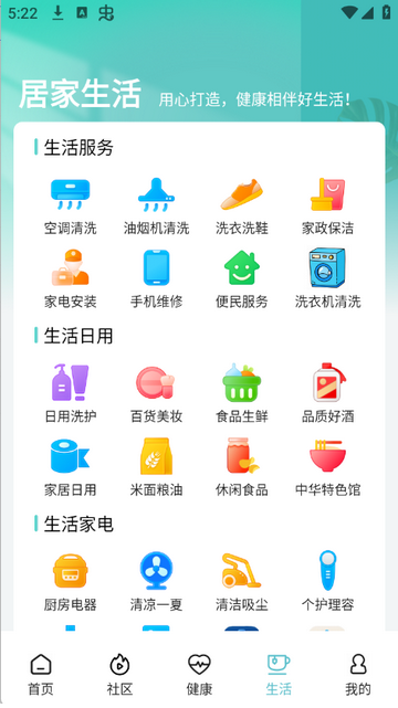 3、点击社区,登录后可看附近家电清洗/健康美食等功能