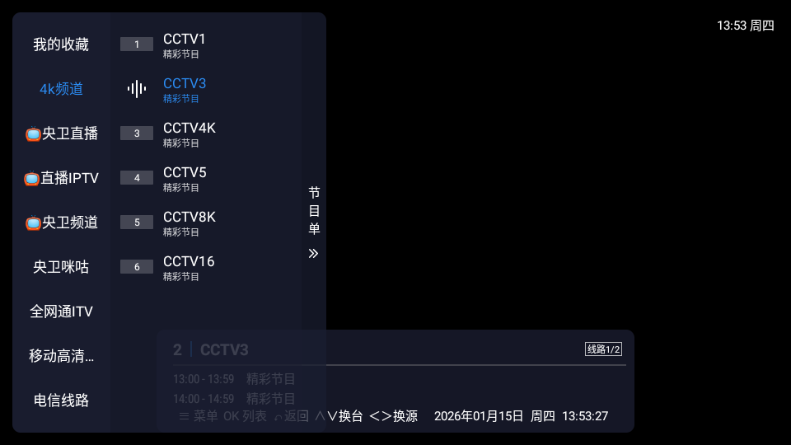 2、在这里有不同播放源的不同节目;