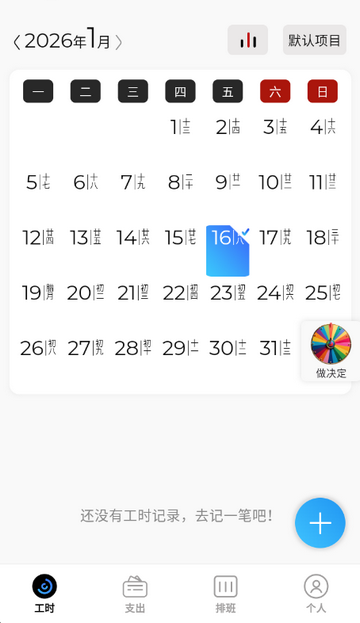 一款适配多种人群的移动端记工时工具,提供工时记录、薪资计算、收支记账及班次管理服务,通过日历视图可视化呈现数据,助力用户高效管理工时、清晰核算薪资、灵活规划排班,兼顾记工与财务管控需求。