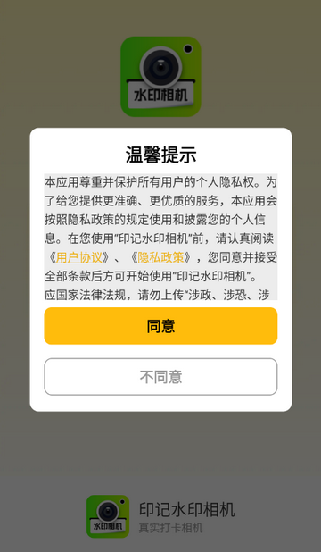 1、打开印记水印相机app,点击同意隐私政策