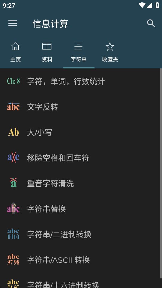 字符,单词,行数统计,文字反转,大/小写,移除空格和回车符,重音字符清洗,字符串替换,字符串/二进制转换,字符串/ASCII 转换,字符串/十六进制转换。