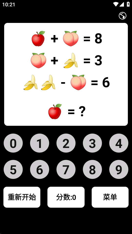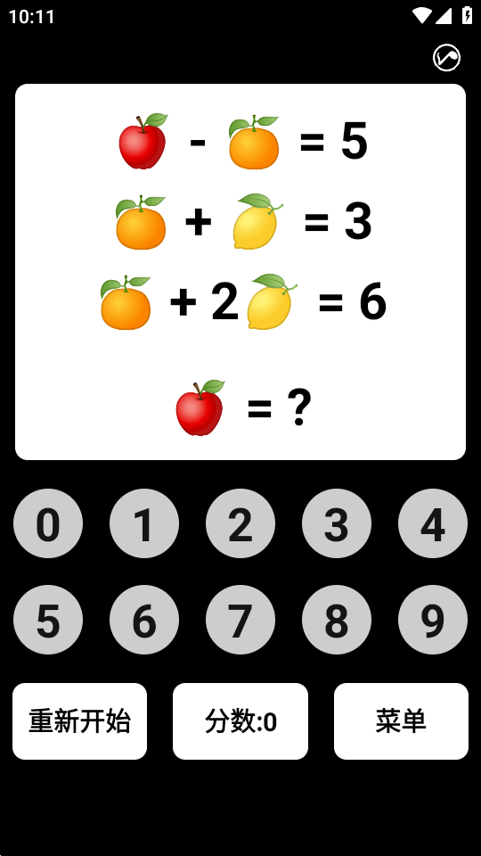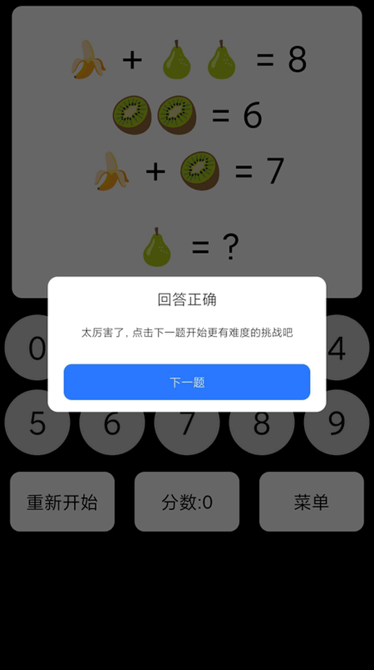 快速训练个人数学计算能力,心算能力,对数字的认知还有敏感度,通过对水果总价的告知,计算得出对应水果的价格