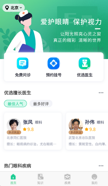 2、进入眼科医院挂号网app首页,可以使用免费问诊、预约挂号等功能