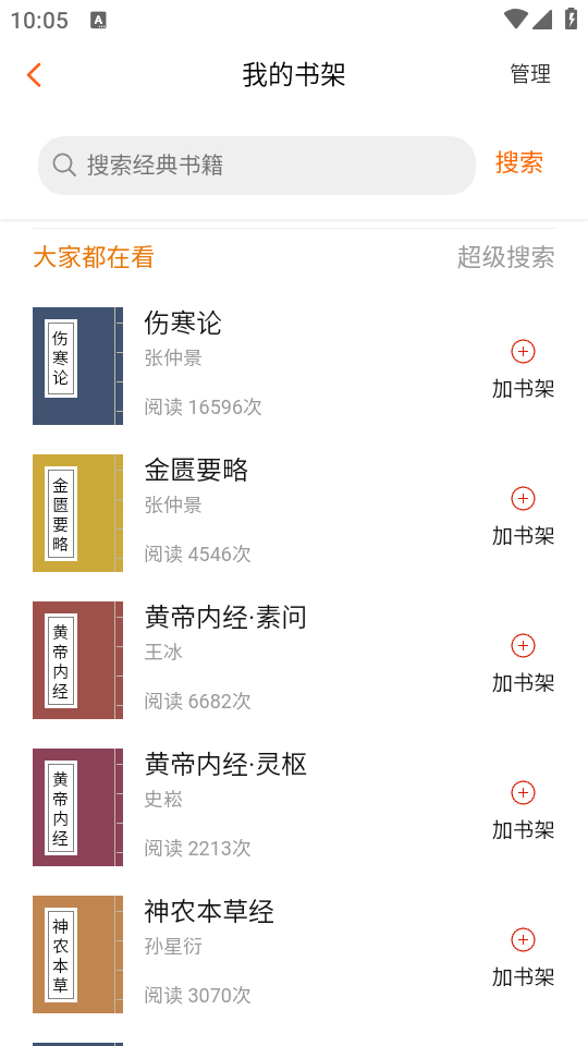 6、在我的书架中可以搜索各种经典书籍,一键加到书架中。