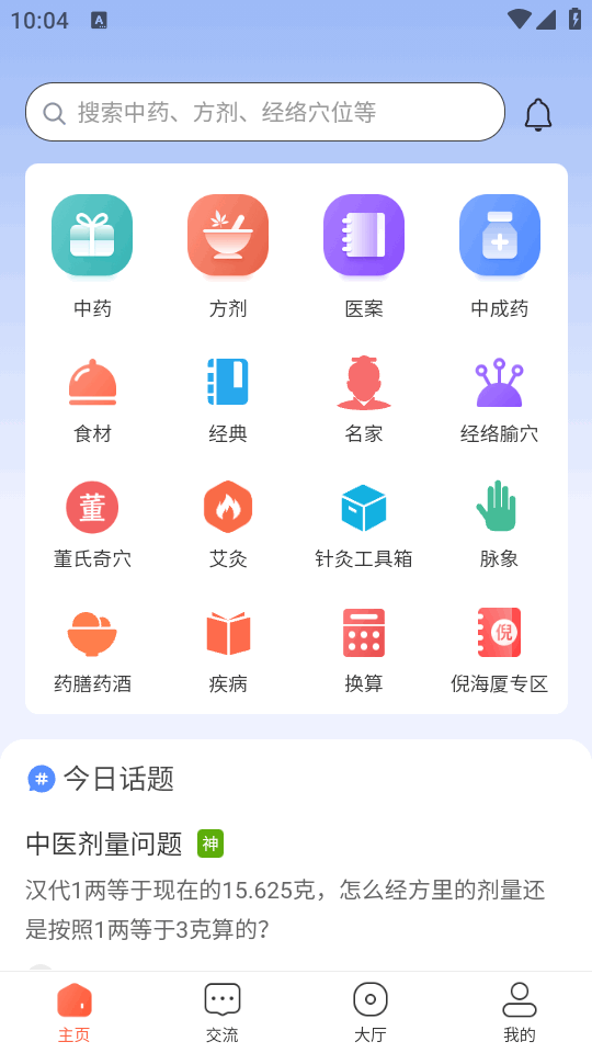 app名字中医之家,非常适合初学者学习中医以及进阶学习,倘若朋友你身上有点小毛病,可以直接“吾有一友,借一步说话”,通过聊天社区可以交流病情;这里还有中药识别区域,其中还有中药图片和详细作用,例如人参,黄芪,白术;如果你想阅读中药古籍阅读材料,这里还有超多中药经典书籍,比如张仲景的伤寒论,《黄帝内经》,本草纲目,肘后备急方,医学三字经等;如果你喜欢历史,还能了解历史上著名医学家,学习他的著作,经历;这里还有倪海厦老师专区,可以学习他的医案,穴位讲解以及病症研究成果,还有董氏奇穴部位讲解;如果你平时不知道吃什么,这里还有食材讲解,更好的调理你的身体;如果你想自己制备中成药,这里还有配方和步骤,比如六味地黄丸,逍遥丸,速效救心丸...;如果你感觉身体不对劲,这里还有疾病症状可以查询,更快知道自己是患上了什么病该怎样治疗;最后这款软件还能教你如何艾灸,适用范围和注意事项。