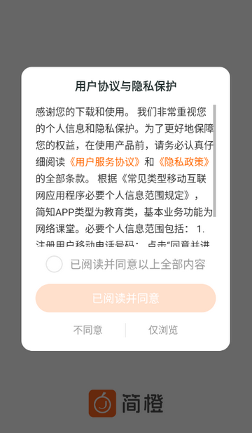 1、打开简橙app,点击同意隐私政策