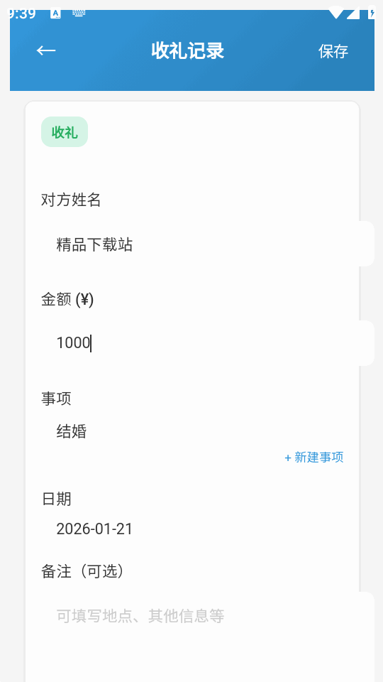 2、进入后输入相关的姓名,金额及事项,点右上角的保存即可。