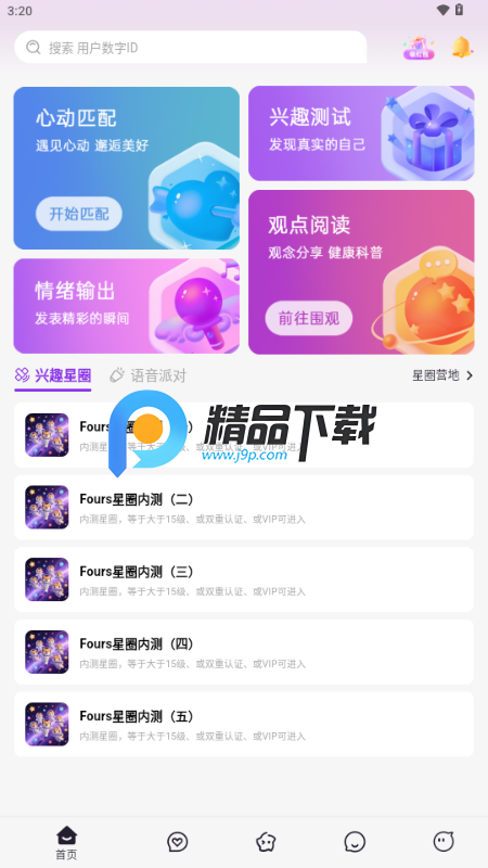 Fours情绪星球是一款专注于小众爱好圈子的交友软件,构建了一个独特的社交星球。用户可以在这里输出个性化态度,表达新奇观点,寻找志同道合的人。平台提供多种交友功能,如附近的人、星球测试、轻语听听和心动卡片,帮助用户邂逅新奇美好的关系。