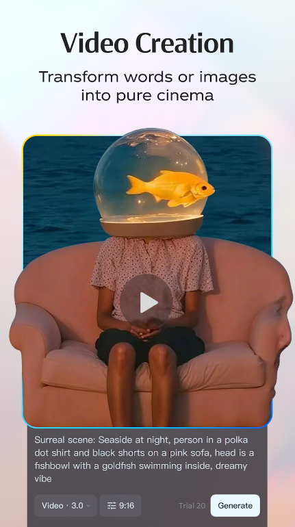 - 视频创作:将文字或图像转化为纯粹的电影效果。只需输入简单的文字,即可为您喜爱的作品制作动画,或生成引人入胜的视频片段。用动态效果赋予您的故事生命。