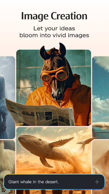 - 图像创作:让您最天马行空的想法闪耀全场。从穿梭云端的鲸鱼到策马扬鞭的宇航员,只需用文字描述您的构想,我们的 AI 便会为您创作出令人惊艳的高质量图像。