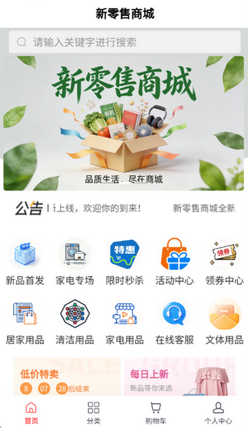新零售商城app是一款聚集各类优质产品的移动应用程序,核心宗旨是通过线上平台优化购物全流程,为用户提供便捷、安全、高效的线上购物服务,简化选购、支付、订单跟踪等环节,让用户足不出户就能轻松购买优质商品,提升整体购物体验。