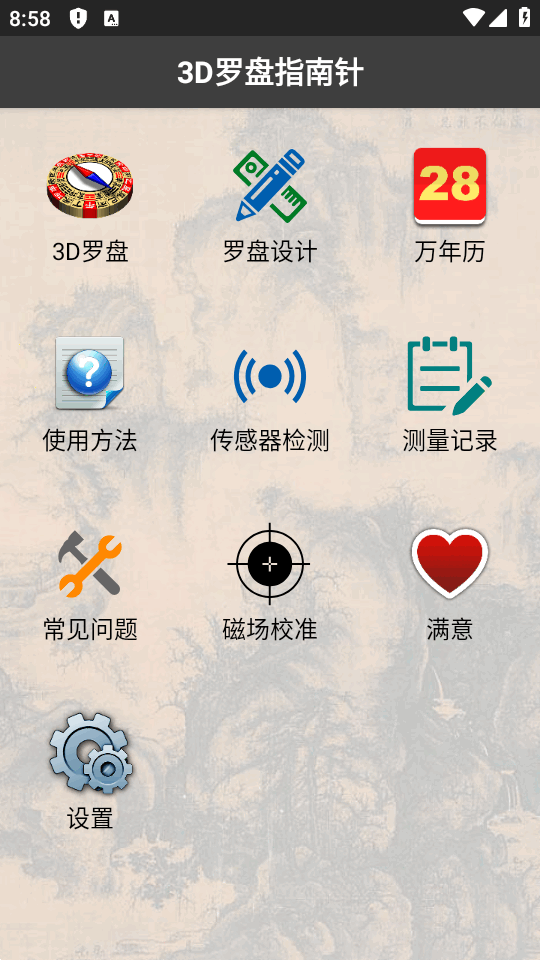 集3d地理测算,移动手测算方位,ar场景展示等多种功能为一体的风水罗盘工具,3D罗盘指南针免费版,下载安装后即可免费使用,所有功能点开即可选择操作,功能很多,内置传感器检测和使用方法,不太了解的先看看介绍再使用,功能不止这些,有兴趣研究风水的朋友手机上可以备一个。