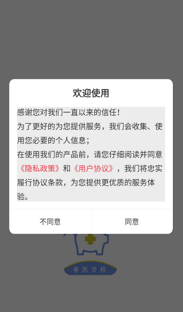 1、打开执业兽医百分题库app,点击同意隐私政策