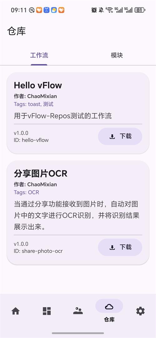 安卓手机上完全高度自由可定制的自动化开源工具,vFlow中你可以自由创建工作流和模块,用户可通过图形化的界面来完成一系列的动作模块,实用高度自由可定制化的完成各种日常,重复性的屏幕操作,内置了很多工作流和模块可以选择下载使用。