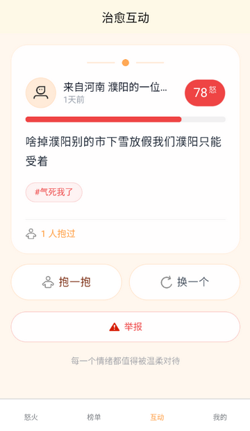 4、用户可刷到其他陌生人的情绪倾诉内容,通过点击“抱一抱”给予安慰。