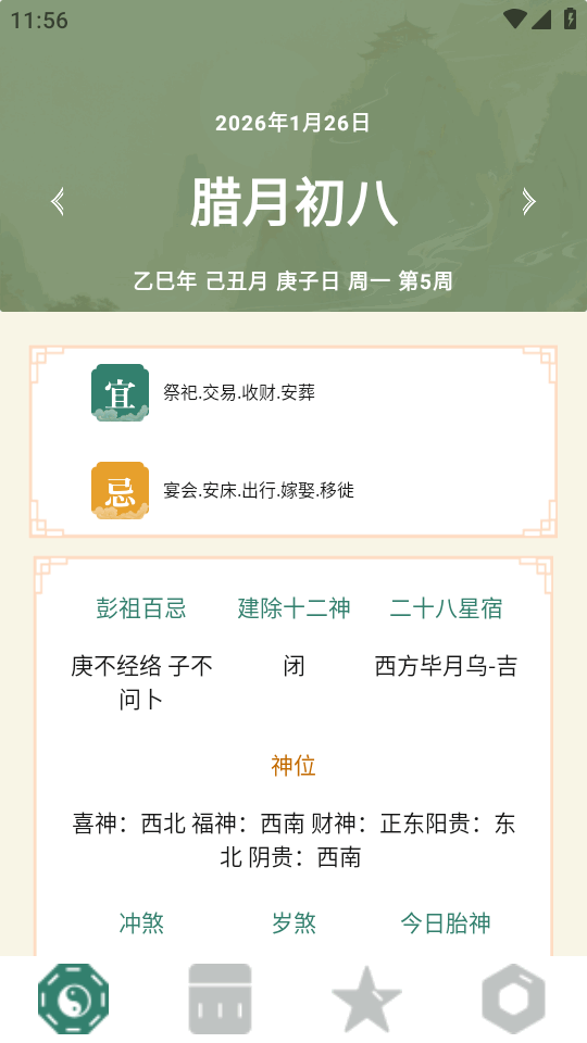 2、进入软件会显示当天老黄历信息,点右侧箭头可以查看明天的信息。